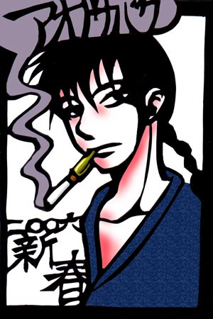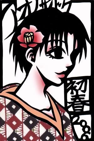 ■年賀状バトル■ 「年賀状、どうするの?」 傍でかすみが尋ねてきた。 「んー、どうしよう。」 あかねは迷いながら話す。 暮れの押し迫った頃になると、決まって「年賀状」で悩む。年賀状そのものは、十一月の初めに発売されるから、その頃から準備にかかれば、難なくこなせるものだが、「まだ日があるからいいや。」と思うと、なかなか取り掛かれず、気がつくと「元旦配達締切日」ということは多々ある。 そうなると、もう、修羅場だ。 別に、一年の挨拶だからと、笑って済ませればよいが、遅れて届く年賀状は、何となく間抜けな気がしてならない。が、とうにクリスマスは過ぎ去り、新年まで、あと一週間を切った。既に、新年へのカウントダウンは始まっている。 子供の頃は、サインペン片手に、干支の絵を描いて投函したものだが、お世辞にも「イラストのセンス」は良いとは言えないので、今は絵も描きたくない。かといって、毛筆が上手いわけでもなく。今はやりの写真年賀状も、何となく好きになれない。 「はああ…。絵心が無いものにとっては、年賀状って拷問みたいだわ…。特に、今回は特別だものねえ…。」 まだ、紐解かれていないままの、まっさらな年賀状の束を見詰めながら、ふううっと溜息を吐いた。 と、横から、なびきが声をかけてきた。 「あのさあ…。年賀状のネタに詰まってるんなら、良いものがあるんだけど…。」 にたりと笑うところを見たら、あかね相手に体よく商売をする気のようだ。 「うーん…。ネタをまずは訊いてから、買うかどうか決めたいわ。」 この守銭奴姉にはいつも煮え湯を飲まされている。それに、クリスマスだの何だのと年末行事をこなすのに、正月を目前に金欠だ。自然、慎重になる。 「見たら買いたくなると思うわよ。乱馬君も乗ってきたんだから。」 「はあ?乱馬も?」 意外そうな顔を手向けた。乱馬が年賀状を真面目に書く気になっているのが、不思議に思えたからだ。 「そりゃあ、独身最後の年賀状だもの、それなり「気合」入ってるんじゃないの?」 と姉は、傍で笑った。 「独身最後ねえ…。まあ、そうには違いないんだけど。」 照れ笑いしながら、あかねが答えた。 そうだ。やっとこ来春、彼とあかねは「永い春」に終止符を打つ。来年からは連盟で年賀状。「天道あかね」として書く、最後の年賀状になるのだ。 「ほらほら、どうする?年賀状の図案、買うの買わないの?」 「年賀状の図案?」 あかねが目をくりんとさせたところで、乱馬が入ってきた。 「おっ!おめえ、やっぱり、あかねにも商売を吹っ掛けてやがったか。」 と話しかけてきた。 「乱馬、お姉ちゃんの図案買ったの?」 あかねが目をくるりんとさせて尋ねた。 「ああ、結構、いい感じだったからな。使わせてもらうことにした。おめえのも、先に見せてもらったけどよ、結構いい感じだったぜ。」 「どう?これでも、乗る気にならない?」 両方から詰め寄られると、さすがのあかねも見ないわけにはいかなくなった。 「わかったわよ…。で?いくらで見せてくれるの?」 「一枚…千円ね。」 抜け目が無い姉の言葉に、渋々財布を出してきた。 「毎度ぉ〜。」 そう言いながら、なびきはすっと「図案」を差し出す。 「あ?これ…。」 目を通すと、切り絵の図案だった。 「なかなかでしょう?青野砂漠さんに描いてもらったの。」 となびきが笑った。 「青野砂漠さんって、なびきお姉ちゃんのお友だちの?」 とあかねが目を輝かせた。 最近、ちょくちょく美術雑誌や絵本なんかの分野で、この独特のタッチの切り絵を見かけることが増えた「新進気鋭の切り絵作家」だ。どう繋がったのかは知らないが、なびきと懇意なのである。 「この前、久々に町で行き会ってさ、図案を描いてもらったのよ。あかねのと乱馬君のと二枚ね。」 このしたたかな姉はどうやら、商売の嗅覚を働かせたのか、友人の売れっ子作家まで巻き込んだ様子だ。 恐らくは、来春結婚する格闘家たちのために、祝いだとか何とかそそのかして、くだんの作家に似顔絵のカットを描いてもらったのだろう。 「俺のはこいつだ。」 乱馬がすいっと嬉しそうに脇から差し出してきた。 和装のそれらしい乱馬。なかなか「粋(いき)」な感じで描いてある。和装なので、正月のイメージがある。 「こいつを、切り絵してみることに決めたんだ。」 と乱馬は屈託無く笑う。 「切り絵にするの?」 「ああ、せっかく「下絵」として貰ったんだ。ちゃんと作品にしてやんなきゃ、かわいそうじゃねえか。」 そう返って来た言葉に、あかねがきょとんと彼を覗き返す。このまま、パソコンにでも取り込んで、印刷して使うのかと思ったのに、律儀にもちゃんと切り絵に仕上げてからパソコンで取り込んで使うという。 「ま、不器用なあかねには無理だろうがな。」 不用意な彼の一言が、あかねの心に火をつけた。 「何ですってえ?」 メラメラと燃える、闘争心。 「いいわよ、あたしも、これを切り絵に仕上げてみせるわ!」 鼻