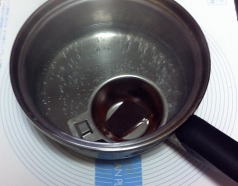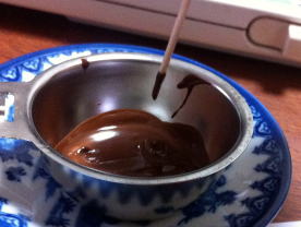 電磁調理器があるのなら、それを机に置いて使うことをお勧めします。(楽なので) コンロの場合は、鍋敷きで、鍋ごと下ろすようにした方が、チョコを再加熱するとき便利です。 チョコは湯煎で溶かします。 この時、水が入らないように注意! 10グラム、欠片をカップに入れて、とろりと溶かします。 |