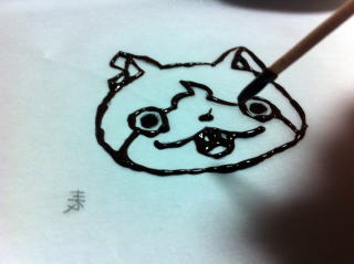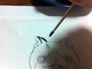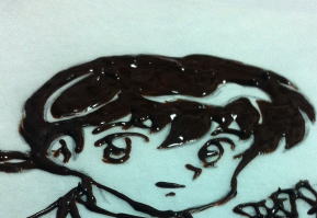 もし、途中で線がはみ出して失敗しても、いじらないこと。 チョコが乾いた後で、つまようじの先で失敗した部分をこすったり削ったりして修正できます。 もし、黒い部分があれば、そこを先に塗りつぶします。 写真では口の部分だけを塗りつぶしました。 塗りつぶしも、盛る…イメージで。 |