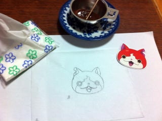 白い台紙の上にクッキングシートをセット。 この時、必ず、描いシートを裏返します。 つまり、鉛筆で描いた面を下にします。 でないと、チョコを流した時、鉛筆線がチョコにくっついて、食べられなくなります。(ここは、注意してください!) 絵を描いた時に、文字を入れておくのも、判別する時に役に立ちますよ。(写真は「表」と書いています) わかりやすいように、元絵のジバニャンを上に置きましたが、耳が左右逆になっていることがわかりますよね? |