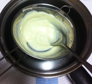 ホワイトチョコを溶かす時は、あまり温度をあげすぎないように、スプーンでかきまわします。全部溶けたら、火を止めて、なめらかになるように、泡がたたないようにスプーンで混ぜて練ります。