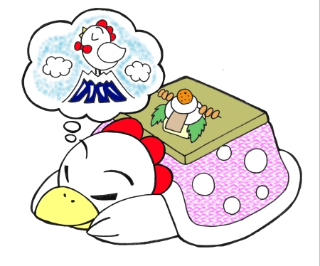 一之瀬の年賀状「夢見るコタツドリ」です。