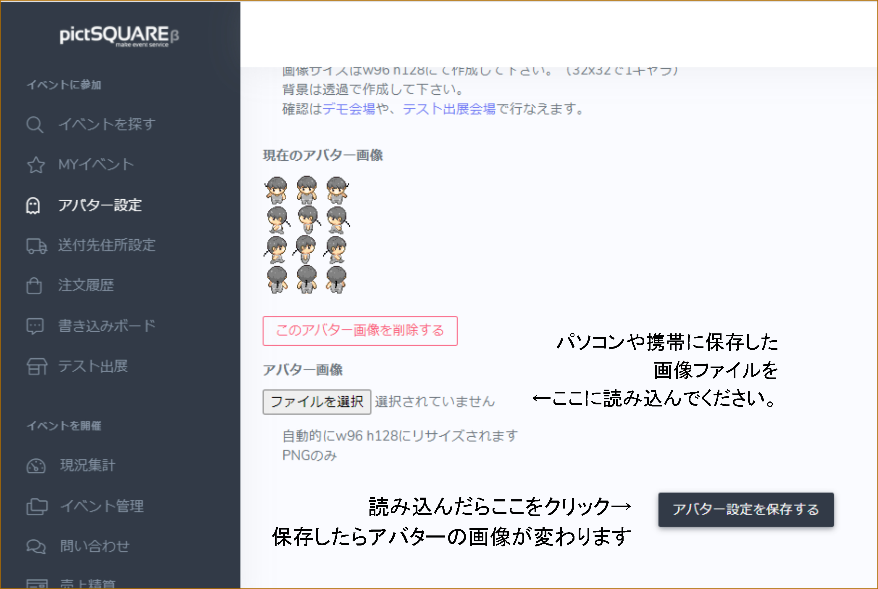 保存した画像ファイルを選択して「アバターの設定を保存してください。